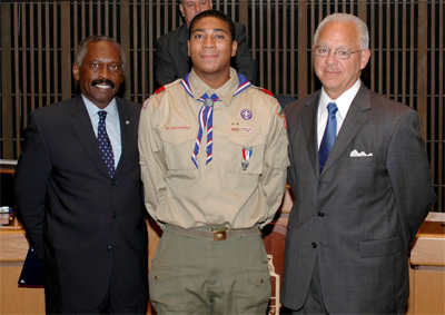 Eagle Scout Eric Crowell with Councilman Bob Weiner and Councilman Penrose Hollins - 8/25/2009